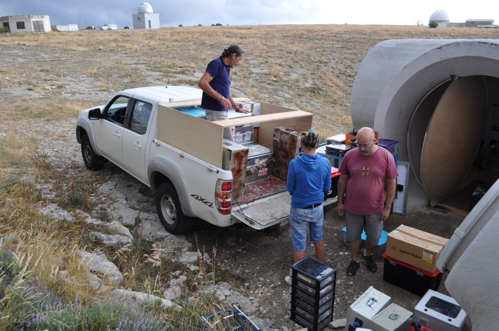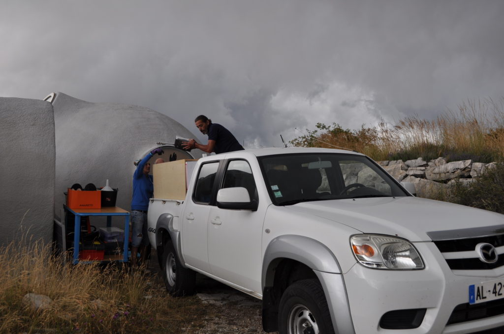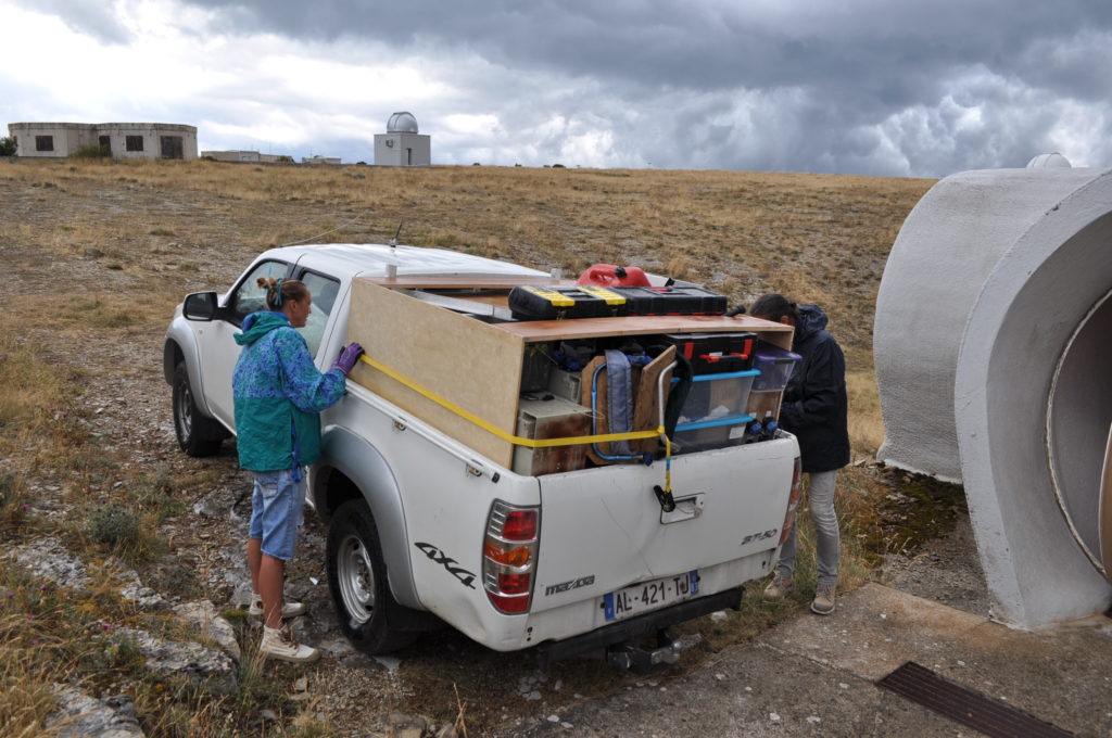 Chargement très lourd et très volumineux du matériel à Calern (Observatoire de la Côte d'Azur). Ce matériel va voyager sur des routes de montagne étroites et sinueuses, sans parapets, franchir des cols en altitude puis être acheminé par une piste effroyable jusqu'à la Moutière où une équipe de bénévoles enthousiastes va l'installer pour tester le prototype de l’Hypertélescope du futur.