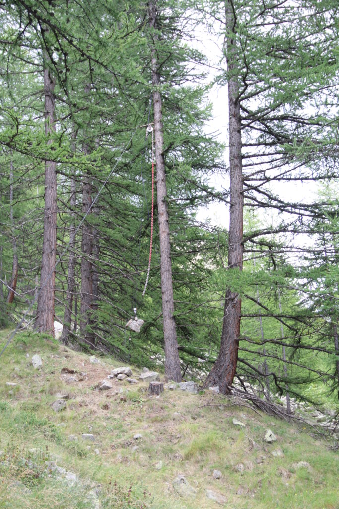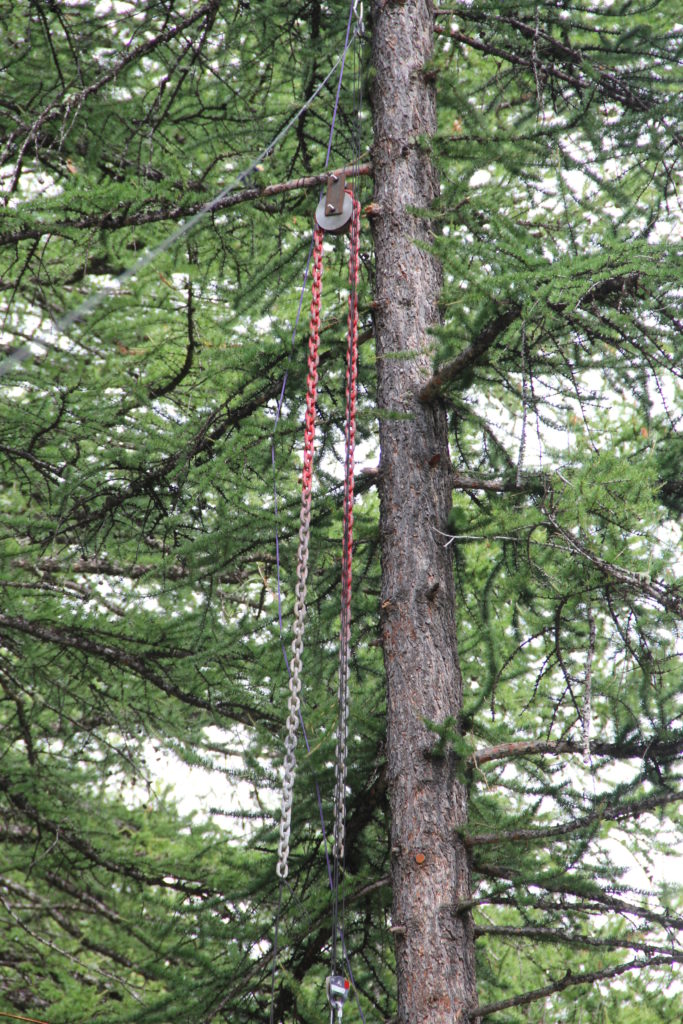 Installation de la cordelette de rappel pour éloigner le contrepoids du tronc du mélèze Contrepoids éloigné du tronc du mélèze par la cordelette de rappel (jaune) Vue d'ensemble. En agrandissant l'image on voit bien la cordelette de rappel (jaune), qui écarte le contrepoids du tronc du mélèze