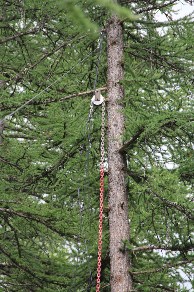 Vue d’ensemble. En agrandissant l’image on voit bien la cordelette de rappel (jaune), qui écarte le contrepoids du tronc du mélèze