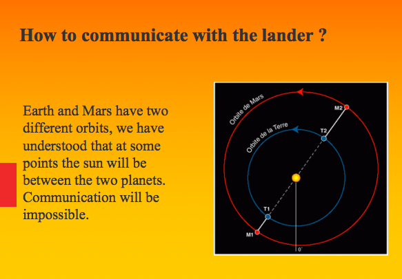 Il n’est pas simple de communiquer avec la Terre depuis Mars car la distance Terre-Mars est variable. Un retour sur le système solaire, les orbites et la position des planètes dans le temps est nécessaire. C'est une belle occasion de pratiquer les mathématiques à l'aide des problèmes proposés par 'Space Maths NASA'. Les élèves auront ici à constater, qu'à certains moments, la communication directe entre la Terre et Mars est tout simplement impossible. Il faudra alors imaginer d'autres solutions de communication.