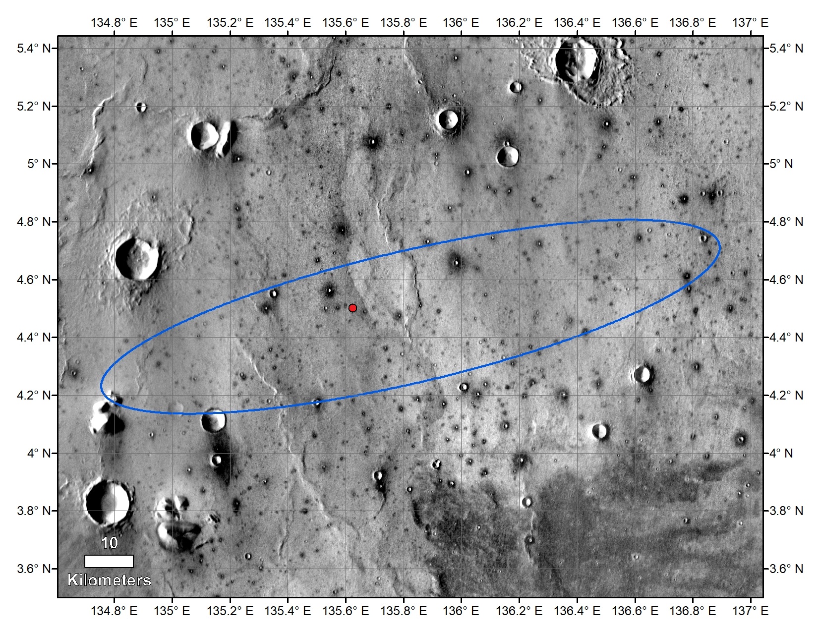 The red dot marks the final landing location of NASA's InSight lander in this annotated image of the surface of Mars, taken by the THEMIS camera on NASA's 2001 Mars Odyssey orbiter in 2015. The landing ellipse on this map covers an area within which the spacecraft had about a 99 percent chance of landing when targeted for the center of the ellipse. It is about 81 miles (130 kilometers) long, generally west to east, and about 17 miles (27 kilometers) wide.
